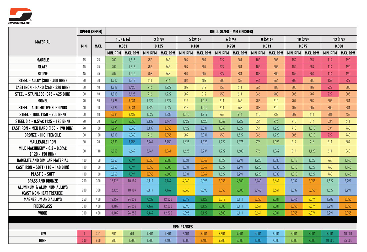 Dynabrade recommends specific speeds for different materials and drill diameters. These recommendations are based on testing and experience to ensure the best possible results. Here is our chart: